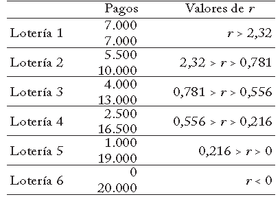 donde 1 y 2 son las loterías binarias y a y b representan cada uno de los pagos. Al resolver estas ecuaciones para nuestras loterías obtenemos los coeficientes de aversión al riesgo resumidos en el cuadro 1.