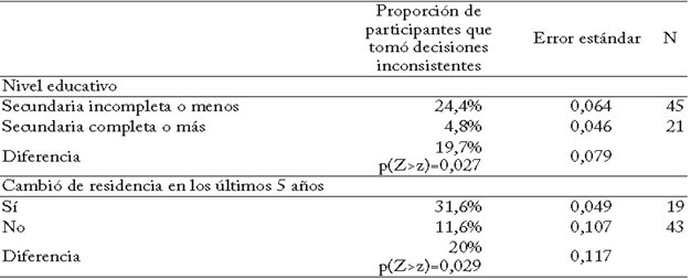 De los participantes, 12 presentaron algún tipo de inconsistencia en su elección temporal (18% de la muestra). El cuadro 3 resume las variables que posiblemente están correlacionadas con elecciones inconsistentes durante el experimento. El 24% de las personas que no terminaron bachillerato tomó alguna decisión inconsistente, mientras que solo lo hizo el 5% de las personas que terminaron educación se cundaria (p(Z>z)=0,023). El 32% de los individuos que cambiaron de lugar de residencia en los últimos cinco años tomó alguna decisión inconsistente, mientras que solo el 12% de las personas no desplazadas lo hicieron (p(Z>z)=0,029).
