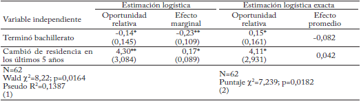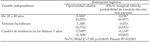 Para entender mejor cómo se relacionan estas variables con la probabilidad de revelar cierta preferencia temporal estimé un modelo logístico ordenado. Los resultados se resumen en el cuadro 6. La edad (pertenecer al grupo de 20 a 40 años) y el cambio de lugar de residencia son estadísticamente significativos. Las personas que hacen parte de este grupo etario tienen una probabilidad de tomar la elección más paciente 10 puntos porcentuales mayor. Por otro lado, los individuos que llegaron recientemente al municipio tienen una probabilidad de tomar la decisión más paciente 13 puntos porcentuales menor. Cabe aclarar que en este estudio no es posible identificar las razones por las cuales las personas desplazadas tienen indicadores de preferencia temporal más altos. Si bien puede ser por la influencia de la exposi ción al conflicto armado sobre las preferencias temporales, también es razonable pensar que el desplazamiento indica unas condiciones económicas más difíciles.