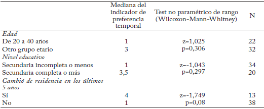 Para analizar los resultados de nuestro estudio dividí la población en tres grupos etarios: menores de 20 años (3 personas), entre 21 y 40 años (22 personas) y mayores de 40 años (29 personas). Si la hi pótesis del ingreso permanente se cumple, las personas del segundo grupo deberían exhibir un indicador de preferencia temporal menor que el de los otros grupos. Aunque la mediana del indicador de pre ferencia temporal (1) para este grupo es menor que para el resto de la población (3), esta diferencia no es estadísticamente significativa (Wilcoxon-Mann-Whitney z=1,025; p=0,301).