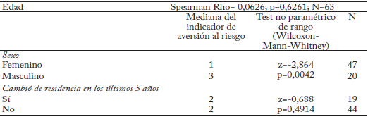 Edad. En la línea de otros estudios previos, Cárdenas et al. (2013) y Rieger et al. (2013) encontraron que la edad está asociada a la aversión al riesgo, especialmente al riesgo por ganancias. En nuestro estudio no encontramos una asociación monotónica entre el indicador de aversión al riesgo y la edad (Spearman Rho= 0,0626; p=0,6261).