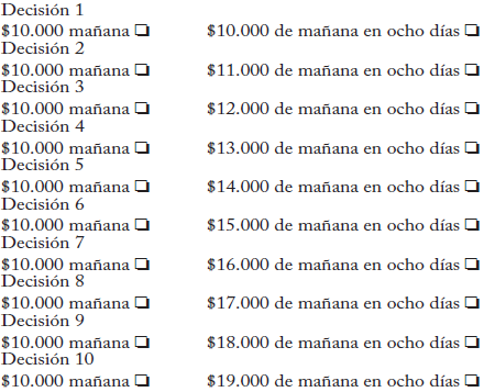 En nuestra lista múltiple de precios la primera opción de cada línea era siempre recibir $10.000, no el mismo día del experimento sino al día siguiente, para neutralizar cualquier ruido que pudieran causar los costos de transacción y los problemas de confianza. Como las personas favorecidas por el sorteo tenían que volver a las oficinas de la Fundación por su premio sin importar su decisión, los factores mencionados no producían un sesgo a favor de la decisión más cercana. De esta manera nos acercábamos al objetivo de la actividad: que los participantes imaginaran un problema lo más parecido a la elección abstracta entre dos cantidades de dinero en el tiempo.