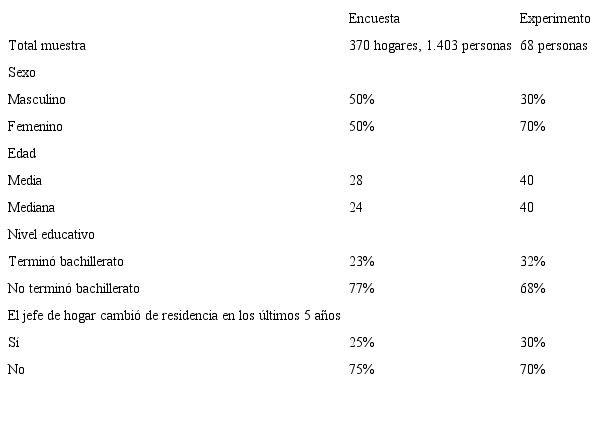 Este estudio tiene tres grandes limitaciones: 1) el tamaño de la muestra solo permite ver las correlaciones y los efectos de gran mag nitud, 2) no permite hacer inferencias causales ni establecer los me canismos por los cuales ciertos grupos tienen preferencias diferentes, y 3) aunque en la encuesta de hogares se siguió un procedimiento aleatorio estándar y es representativa de la zona urbana del pueblo, la sub muestra utilizada para el experimento tuvo sesgos de selección; el más importante es que solo invitamos personas que supieran leer y escribir. Esto limita la validez externa de los hallazgos. Sin embargo, la sub muestra es variable en factores clave como la edad, el sexo, el nivel de ingresos y el desplazamiento.