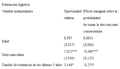 El cuadro 8 resume los resultados de la estimación de un modelo logístico ordenado en donde la variable dependiente es el indicador de aversión al riesgo. Controlando por la edad y el sexo, las perso nas recientemente desplazadas tienen una probabilidad 28 puntos porcentuales más baja de tomar la decisión más conservadora. Este resultado, significativo a un nivel de confianza del 10%, implica que las personas expuestas al conflicto armado o con peores condiciones económicas están más dispuestas a escoger las loterías riesgosas. Por otro lado, controlando por los otros factores, los hombres tienen una probabilidad 47 puntos porcentuales más baja de tomar la decisión más segura.