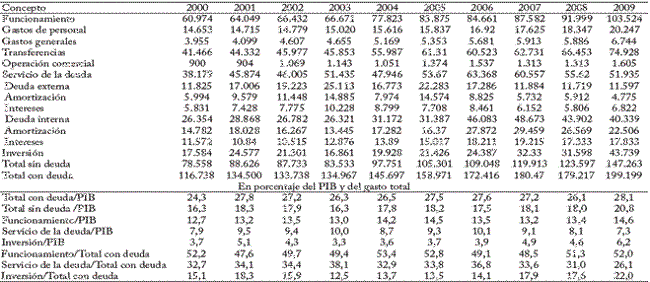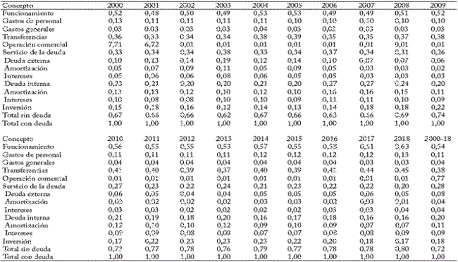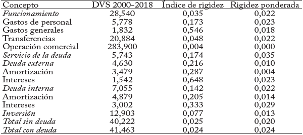 Las partidas más rígidas fueron las de intereses de la deuda externa, gastos generales e intereses de la deuda interna. Las menos rígidas fueron las de operación comercial, transferencias e inversión. cuando se incorpora en el análisis el peso relativo de las partidas con respecto al total del gasto, las partidas más rígidas son las de intereses de la deuda interna, gastos de personal e intereses de la deuda externa. Y las menos rígidas, las de operación comercial, amortización de la deuda externa e inversión.
