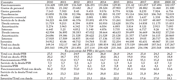 Por su parte, el cuadro 3 muestra que la composición del gasto solo ha cambiado ligeramente en ese periodo de 18 años. En 2000 los gastos de funcionamiento, servicio de la deuda e inversión representaban el 52%, el 33% y el 15% del gasto público, respectivamente; en 2018 representan el 63%, el 20% y el 17%. La reducción de la participación de la deuda se tradujo en un crecimiento significativo de los gastos de funcionamiento y en mucha menor medida de la inversión.