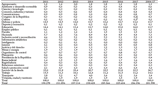 El presupuesto también se presenta según su distribución sectorial. Elcuadro 5 muestra la estructura de la ejecución presupuestal entre 2004 y 2017. cabe destacar que el rubro más importante es el servicio de la deuda, que promedió el 26,7% del total. El segundo más importante es trabajo, que promedió el 14,1% e incluye entidades adscritas y vinculadas como el Sena, organizaciones solidarias, Servicio Público de Empleo, Colombia Mayor, Superintendencia de Subsidio Familiar y Colpensiones.