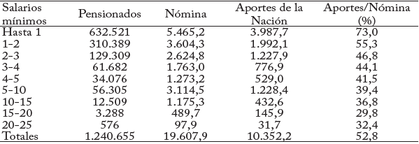 En los cálculos de Colpensiones (cuadro 6) la estructura de aportes de la Nación es progresiva porque la relación entre aportes y nómina es mayor a medida que el ingreso disminuye. En las pensiones menores, la relación es del 73%, y en las más altas, del 32,4%. Esta estimación también cuestiona la conclusión del Robin Hood a la inversa.