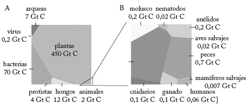 [arqueas 7 Gt C virus o,2 Gt C bacterias t0 Gt C plantas protistas hongos animales moluscos nematodos anélidos aves salvajes peces mamíferos salvajes cnidarios ganado humanos]