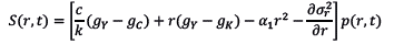 Puesto que solo hemos definido los dos primeros momentos de la dinámica de la tasa de ganancia, y hemos adoptado el supuesto de normalidad de los errores por medio del proceso de Wiener, el principio de máximo calibre se reduce a la ecuación de Fokker-Planck. Así, los cambios de la distribución de probabilidad de las tasas de ganancia en el tiempo se definen por medio de una ecuación diferencial parcial:
