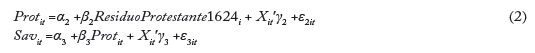 El problema de la causalidad inversa se aborda utilizando un instrumento con un rezago de 200 años. Por construcción, el residuo de esta regresión refleja factores que afectaron la probabilidad de que un condado fuera protestante en 1624, pero que eran ortogonales a cualquiera de estos controles. Por ejemplo, el residuo podría reflejar el papel de campañas militares, relaciones dinásticas, políticas matrimoniales o accidentes históricos7. Con este enfoque abordamos directamente el problema de las posibles violaciones de la restricción de exclusión, con respecto a la influencia de diferencias persistentes de desarrollo económico o de características locales como la etnicidad.