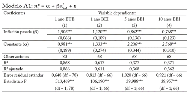 Respecto de los resultados de los modelos A1 se puede afirmar que los coeficientes α y β muestran una tendencia decreciente. Esto indica que la dependencia de las expectativas de inflación respecto al pasado se ha reducido luego de la adopción del esquema de inflación objetivo, aunque aún es importante.