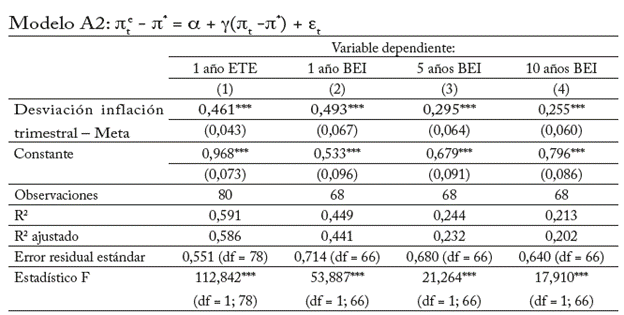 Los resultados de los modelos A2 que relacionan las deviaciones de las expectativas de inflación con respecto a la inflación efectiva y su efecto sobre las desviaciones de la inflación con respecto a la meta definida por el Banco de la República arrojan dos resultados relevantes. El primero, que respalda lo enunciado por Gamba et al. (2016) sobre una reducción del valor al que se anclan las expectativas de inflación y una mayor proximidad a la tendencia de la meta de inflación anunciada por el Banco de la República. Esto se refleja en la reducción marcada de a. El segundo es que la menor persistencia de la inflación pasada sobre la formación de las expectativas respalda la idea de que el país ha venido ganando credibilidad en su política monetaria. Sin embargo, el parámetro y indica que la respuesta de desviaciones de la política monetaria respecto del nivel meta de inflación con relación al error de expectativa de los agentes económicos respecto de esta misma meta, no muestra signos de reducción en el periodo analizado. Los resultados deben analizarse con mayor cuidado en momentos de turbulencia donde la incertidumbre es elevada y no hay forma de verificar el anclaje de expectativas que muestran estos modelos.