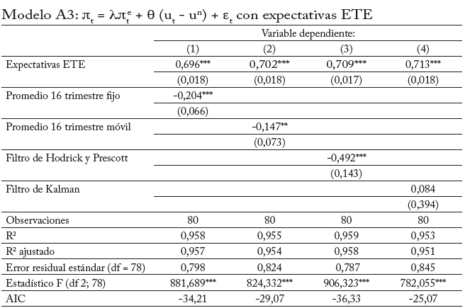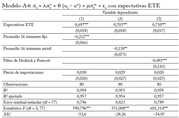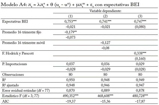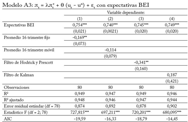 En los modelos A3, para ambas medidas de expectativas usadas (ETE o BEI), se reportan significancia estadística, es decir, al igual que los modelos anteriores subrayan la importancia de las expectativas futuras sobre los mecanismos adaptativos de expectativas. La relación inversa entre empleo e inflación también es significativa y el valor del parámetro 9 que da cuenta de este trade-off tiende a ser creciente en el tiempo y mucho más marcado cuando los valores naturales de tasa de desempleo se obtienen por filtro de Hodrick-Prescott. Según este ajuste, para las dos últimas décadas, por un punto porcentual adicional en la inflación el desempleo cíclico se reduce entre 0,32% y 0,49%.