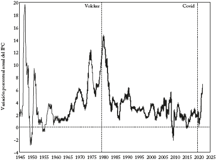 La gráfica 1 muestra toda la historia de la inflación posterior a la Segunda Guerra Mundial en Estados Unidos. Hubo cuatro grandes picos antes del actual, los dos primeros impulsados por guerras (el final de la Segunda Guerra Mundial y sus controles de precios, y el auge de precios de los productos básicos durante la Guerra de Corea). Los dos segundos -en 1975 y 1980- crearon la teoría económica moderna, porque parecieron derribar el argumento "keynesiano" de que la política fiscal podía controlar la inflación y el desempleo.