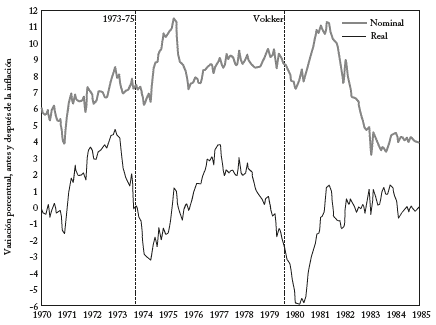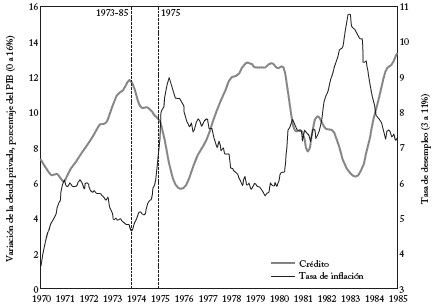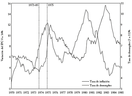El colapso económico se llevó por delante las alzas de los salarios y del precio del petróleo. Los aumentos de salarios, que alcanzaron un máximo del 11% anual en 1981, cayeron al 4% anual en 1983. Los precios del petróleo, que habían pasado de 15 a 40 dólares por barril en 1980, cayeron gradualmente a 30 dólares en 1985 y luego se desplomaron 12 dólares por barril en 1986. Además, la relación negativa entre desempleo e inflación -cuya desaparición entre 1973 y 1975 desempeñó un papel tan importante en la aceptación de la teoría de Friedman- reapareció.