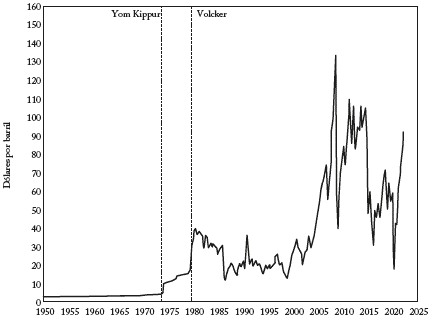 Un segundo hecho, que nunca había ocurrido, provocó un aumento de precios muy superior a la tasa de crecimiento de los salarios: el aumento de los precios del petróleo. Antes de 1973, estos eran fijados ante todo por las Grandes Petroleras: las compañías petroleras de propiedad occidental que dominaban la extracción de petróleo en todo el mundo, incluso en los países árabes. Pagaban a los países productores de petróleo una miseria por regalías, y los precios eran bajos y estables, como queda patente en la gráfica 5, donde el precio es una línea casi plana entre 1950 y 1973. El resentimiento por los bajos precios que recibían por su producto vital motivó a los países productores a formar la Organización de Países Exportadores de Petróleo (OPEP) en 1960.