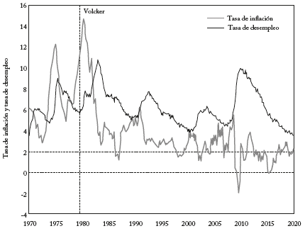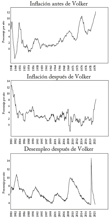 Las acciones de Volcker llevaron a que la tasa de inflación cayera. Pero no por una caída relativamente indolora de las "expectativas de inflación", sino por una recesión salvaje, la más profunda que Estados Unidos experimentó desde la Gran Depresión. La inflación cayó del 15% en su punto máximo a menos del 2% en 1987, pero el desempleo aumentó fuertemente, de menos del 6% cuando Volcker empezó a elevar las tasas de interés, a casi el 11% cuando la inflación había caído a poco más del 2%.