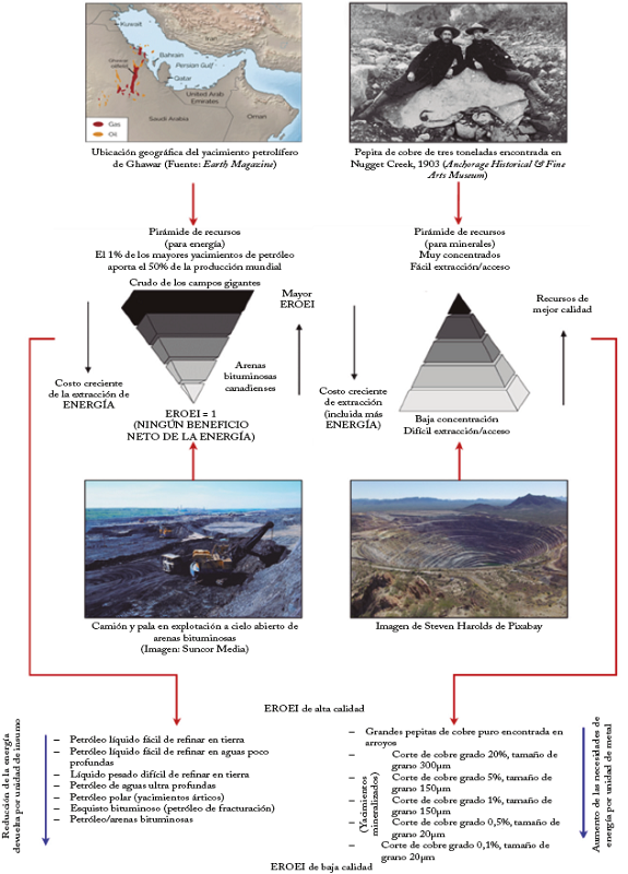 Pero esa fantasía no es posible para el siguiente factor, plasmado brillantemente en la gráfica 8, del ingeniero de minas australiano Simon Michaux. En el pasado, se necesitaba una ínfima cantidad de energía para extraer petróleo y carbón: el "rendimiento energético de la energía invertida" era enorme. Así mismo, los depósitos minerales eran abundantes y fáciles de procesar utilizando energía barata.