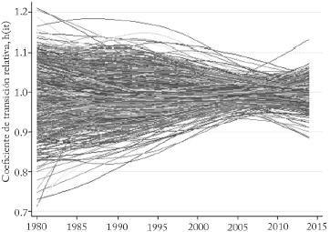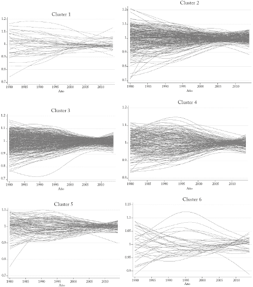 Los resultados anteriores son consistentes con la evidencia presentada en el Gráfico 1, el cual presenta el parámetro hit, mostrando la trayectoria de los factores que generan crecimiento y están asociados específicamente a cada municipio, relativo a los factores que son comunes a todos los municipios. Bajo la existencia de convergencia se debería observar que hit ( 1, para todo municipio i, cuando t es lo suficientemente grande. Aunque para el periodo completo no se observa ese comportamiento, la variabilidad entre las diferentes series de tiempo en los últimos años se reduce.