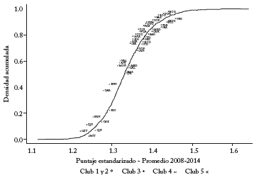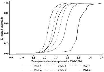 Adicionalmente, se realizó un análisis de los clubes en el periodo más reciente. El Gráfico 3 muestra la distribución empírica del logro académico del año 2014 condicional en los diferentes clubes. La distribución del club 1 domina las demás distribuciones ampliamente, es decir, los municipios que pertenecen al club 1 presentan resultados superiores en el logro educativo comparados con el resto de los clubes. Asimismo, se observa un ordenamiento entre las distribuciones de los clubes 2 a 6, aunque con pequeños traslapes en los municipios con puntajes bajos y altos.