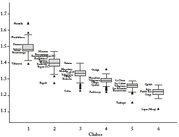 Similarmente, el Gráfico 4 muestra el boxplo, de los diferentes clubes, donde se incluyen los percentiles más importantes de la distribución, como la mediana, el percentil 75, 25 y los valores atípicos inferiores y superiores14. Como se puede apreciar, la mediana del club 1, donde se encuentra la educación pública del municipio de Armenia, es superior al puntaje de todos los municipios incluidos en los otros clubes. No obstante, la dispersión es relativamente mayor en este club. Asimismo, al interior de los clubes 4 y 5 se presentan la menor dispersión con respecto a los demás clubes.