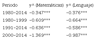 El estimador de la ecuación (11) para el periodo 1980-2014, en la prueba de matemáticas es -0.347 (error estándar = 0.087), y el estimador en la prueba de lenguaje es -0.376 (error estándar = 0.120). En ambos casos la hipótesis nula de convergencia se rechaza (los coeficientes son significativos al 1 por ciento). Los resultados son similares cuando se analizan los subperiodos 1980-1999, 1991-2014 y 2000-2014. Sin embargo, para el periodo 2000-2014, el poder de la prueba se reduce significativamente ya que el test se aplica con pocas observaciones. Aun así, el coeficiente es negativo y estadísticamente significativo.
