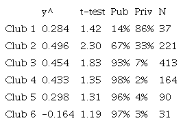 Los clubes 1 y 2, donde se encuentran los dominios con mejores puntajes, están sobre representados por la educación privada. En el club 1 el 86 por ciento de los dominios están asociados a educación privada, en el club 2 es el 33 por ciento. Por el contrario, los clubes 4, 5 y 6, donde se incluyen los dominios con los peores puntajes, presentan una sobre representación de dominios asociados a la educación pública.
