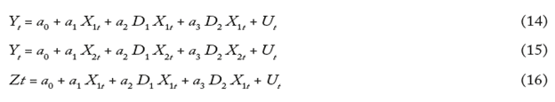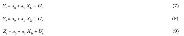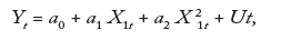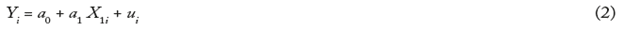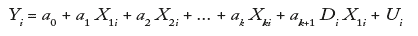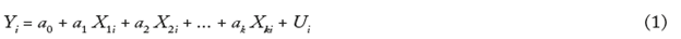 donde, Yi representa la variable explicada y X1, X2, ... Xk las k posibles variables independientes. Los coeficientes aj representan los efectos por los cambios de las variables independientes sobre la dependiente. Por su parte, U representa variables no controlables y aleatorias, denominadas perturbaciones, donde los efectos no representados en las variables independientes se atribuyen a éstas.