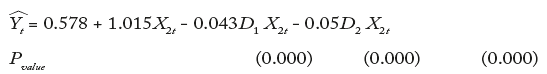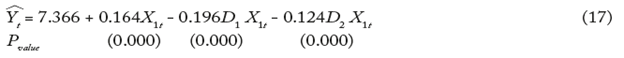 Se muestra que los efectos dicotómicos son significativos, por lo que el modelo de inflación contra salarios mínimos en la época de Felipe Calderón se obtiene haciendo D1 = 1 y D2 = 0 en (17),