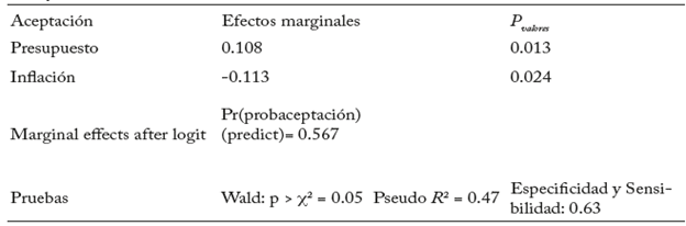 Uno de los objetivos del trabajo es estimar la probabilidad de aceptación de los presidentes de turno, además de evidenciar si la inflación y el presupuesto real fueron participes en dicha aceptación y de qué forma lo hacen.
