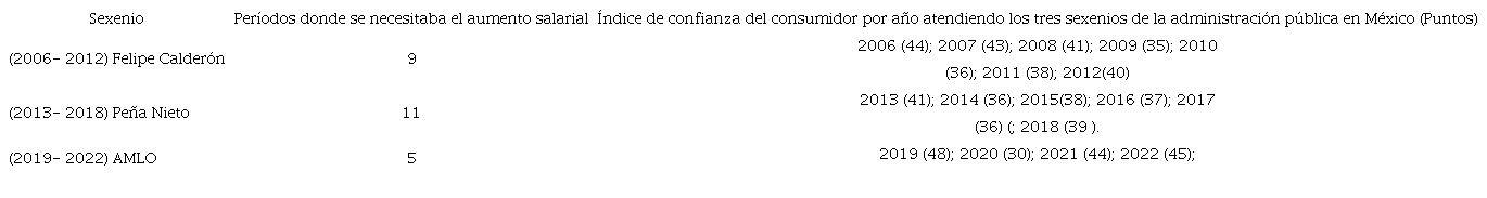El cuadro 2 muestra los periodos en donde la inflación rebasa el crítico 4.18%, acorde con los puntos explicados, reflejando la necesidad de aumentar salarios en cada uno de los sexenios, teniendo en cuenta la confianza de los ciudadanos acerca de su situación económica y, en general, del país. Se puede notar que durante el período 2006 - 2012 el índice de confianza era alto (44 puntos en 2006), pero fue cayendo en los años siguientes, particularmente en el 2009, por lo que nuestras estimaciones con nueve aumentos salariales fueron insuficientes. En el sexenio 2012- 2018, el índice se mantuvo por debajo de los 40 puntos, y sólo aumentó en 2015, cuando se aprobaron reformas estructurales en el sector energético, las que prometían una mayor inversión y mayores fuentes de empleo (Leyva, Páez y Sainz, 2017). Los aumentos salariales en once trimestres fueron insuficientes para contrarrestar el deterioro de la confianza.