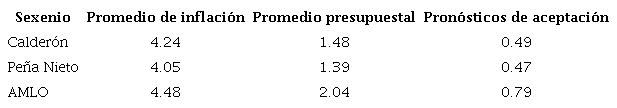 Pasando a la parte intuitiva, los efectos marginales después del logit mostrados en la tabla IV muestran una predicción de la probabilidad de aceptación de 0.56 (fila 4), la cual incrementa 10.8% por los aumentos presupuestales (fila 2 y columna 2) y disminuyen 11.3% por motivos inflacionarios (fila 3 y columna 2). No obstante, podemos estimar los pronósticos promedios de aceptación de cada sexenio con base en los promedios del nivel de inflación y el presupuesto real (ver cuadro 5). Se nota que el pronóstico a través de inflación y presupuesto es relativamente más alto en la actual administración (0.79), comparado con la baja aceptación de 0.47, correspondiente al promedio del sexenio de Peña Nieto. El valor de 0.47 de aceptación pudiera ser exagerado, ya que hay pronósticos mensuales en donde el sexenio anterior mostró niveles de aceptación muy bajos (Anexo 1).