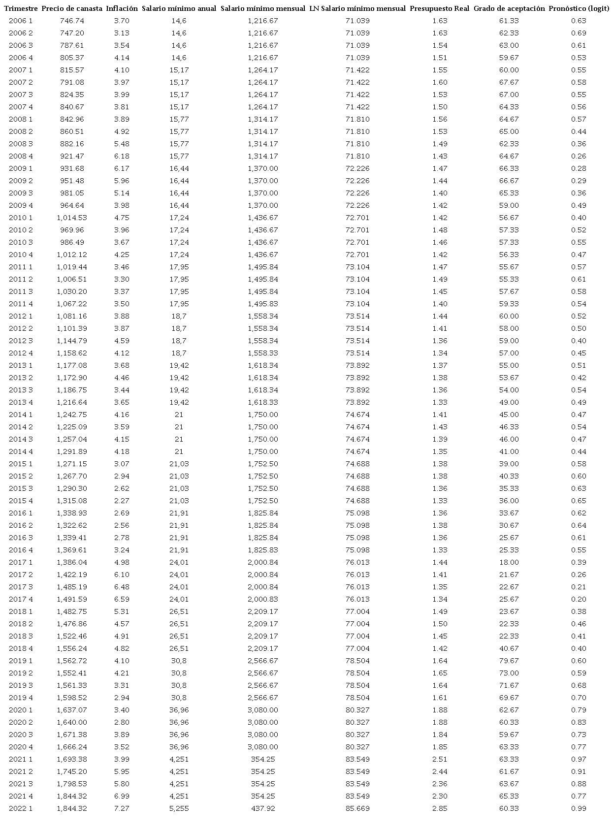 Nuestros resultados muestran, de manera general, que en cada sexenio el aumento de salarios mínimos es una respuesta al aumento de precios, derivados de la inflación, lo mismo que la gestión de posibles demandas ciudadanas que menoscaben la aprobación del gobierno (Carrera, Lara y Policardo 2022). Los efectos de la inflación en la población mexicana los analizan Pardo y Díaz (2014). Los autores construyen indicadores que responden a los aumentos de los precios de productos básicos de la canasta alimentaria durante el periodo 1992-2010. Proponen, además, mecanismos para estimular la producción de estos bienes.