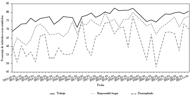 La Figura 1 presenta el porcentaje de personas que reportan altos niveles de satisfacción con la vida (valores > 8) donde se observa que, a lo largo del periodo de estudio, los trabajadores ocupados consistentemente presentan mayores niveles de satisfacción con la vida, mientras que los desocupados se ubican en la parte inferior.