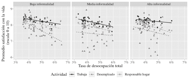 En las regiones con mayor formalidad, se observa una relación negativa entre desempleo y bienestar, mientras que este comportamiento no se presenta en las regiones con alta informalidad, lo cual indica que la influencia del desempleo varía según el contexto regional. Una explicación plausible es que los altos niveles de informalidad en el mercado laboral permiten una mayor flexibilidad y están asociados con condiciones laborales deterioradas, lo que genera una menor diferencia en bienestar entre trabajadores ocupados y desempleados.