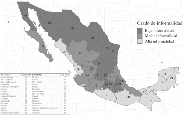 Dado el contexto de disparidad espacial en México y la falta de estudios que incorporen este aspecto en la relación entre desempleo y bienestar, se utiliza la regionalización propuesta por Aguilera y Castro (2016), que refleja la dinámica económica regional del país. Esta clasificación considera tanto la integración al comercio internacional como el nivel de desarrollo de los mercados laborales regionales. De este modo, las ciudades se agrupan en tres regiones con diferentes dinámicas económicas y niveles de informalidad: regiones de baja, media y alta informalidad, que corresponden a una alta, media y baja media y alta informalidad, que corresponden a una alta, media y baja exposición al comercio exterior, respectivamente. La distribución de estas regiones se presenta en la figura del anexo.