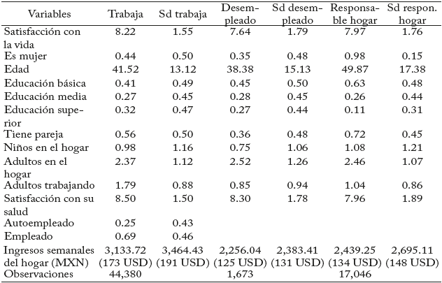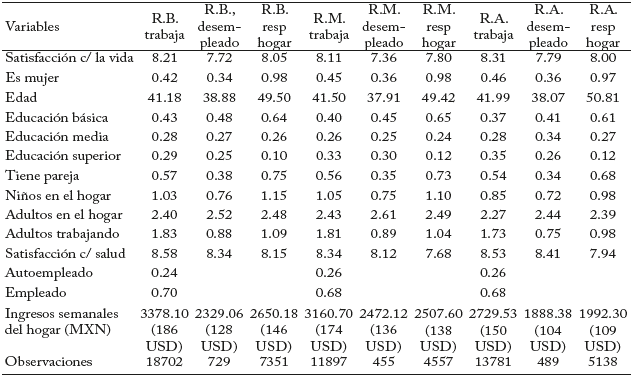 El Cuadro 2 presenta estadísticas descriptivas de toda la muestra según la condición laboral, mientras que el Cuadro 3 muestra esta información desglosada por cada una de las regiones. Se observa que, en general y en todas las regiones, los desempleados están menos satisfechos con la vida que sus contrapartes empleadas. Algunos patrones de la muestra nacional se mantienen constantes en las tres regiones; por ejemplo, los desempleados son, en promedio, más jóvenes, muchos no tienen pareja ni hijos, y hay una menor proporción de responsables del hogar con educación superior. Alrededor de una cuarta parte de los desempleados son autoempleados y el ingreso del hogar es más alto para los trabajadores ocupados.