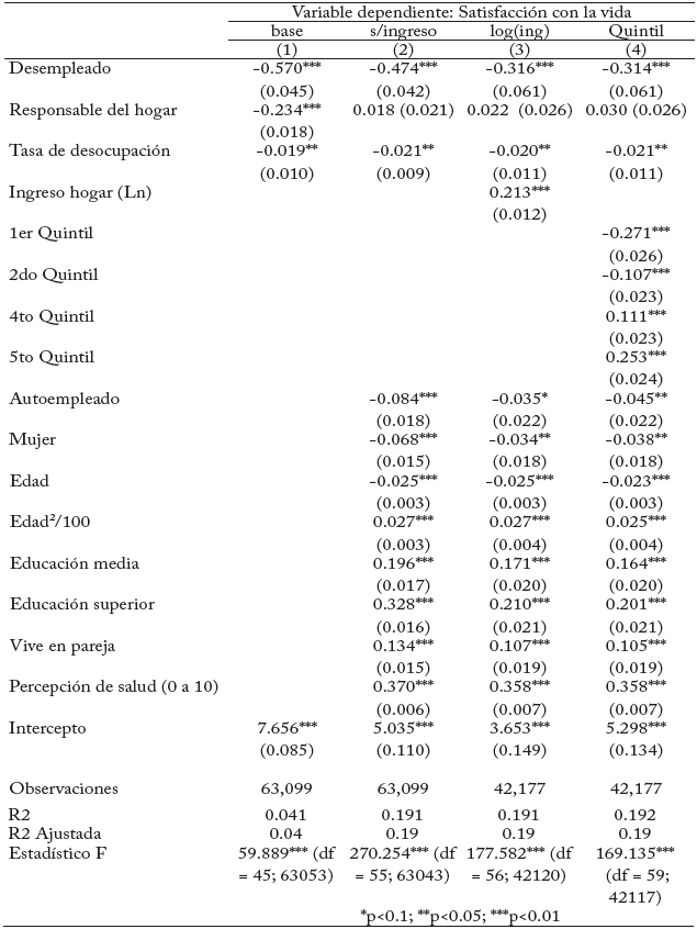 En el modelo de la columna 4, la muestra se dividió en cinco quintiles de ingresos, tomando como grupo de referencia el tercer quintil. En esta especificación, los coeficientes pueden interpretarse como la diferencia en satisfacción con la vida de un individuo perteneciente a un quintil particular en comparación con uno del tercer quintil. Los coeficientes observados son los esperados: son negativos cuando el nivel de ingresos disminuye y positivos cuando aumenta. El cambio más relevante en el coeficiente se observa al comparar el primer y el tercer quintil de ingresos. Sin embargo, es importante señalar que la diferencia de ingresos entre estos dos quintiles es menor que la diferencia entre el tercer y el quinto quintil. Esto sugiere que, a medida que aumentan los ingresos del hogar, su efecto marginal sobre la satisfacción con la vida disminuye (consultar tabla de ingresos en los anexos) (Böckerman e Ilmakunnas, 2006; Carroll, 2007; Chen y Hou, 2019; Eichhorn, 2013).