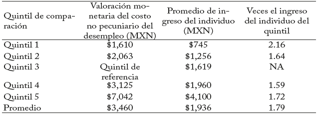 El cuarto cálculo nos indica que el costo no pecuniario del desempleo es dos veces más alto que el efecto de la caída total del ingreso del hogar por el desempleo del individuo, o una valoración monetaria de $5,962 MXN (328 USD, en la media de la muestra).