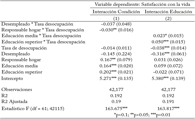 Sin embargo, es posible que, al incrementarse la tasa de desempleo, algunos desempleados experimenten menos presión social para encontrar trabajo, lo que podría reducir las diferencias en satisfacción con respecto a los trabajadores ocupados. Alternativamente, estas diferencias podrían estar vinculadas a las perspectivas de empleabilidad, es decir, que un aumento en la tasa de desempleo en la ciudad no afectaría el bienestar de aquellos con mayor facilidad para encontrar empleo.