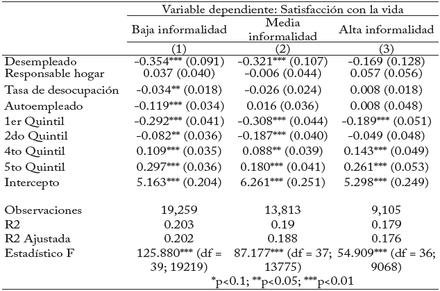 El nivel de formalidad en los mercados laborales también afecta los resultados en cuanto al impacto del desempleo contextual sobre el bienestar subjetivo. Por ejemplo, en un mercado laboral formal, un aumento en la tasa de desempleo suele traducirse en mayor presión sobre los empleados, lo cual disminuye la seguridad laboral y, en consecuencia, su percepción de bienestar. En mercados menos estructurados, los choques económicos, ya sean externos o internos, suelen tener menor impacto, ya que el mercado laboral informal tiene suficiente flexibilidad para absorber a los trabajadores y mitigar la pérdida de bienestar. Por ello, se espera que el efecto sobre el bienestar de un aumento en la tasa de desempleo no sea significativo ni de gran magnitud en la región de alta informalidad.
