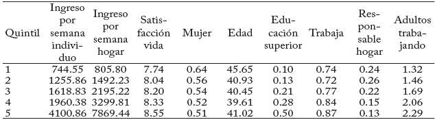 Por ejemplo, seobservaen la columna 4 del Cuadro 4, quecuando la percepción de salud se deteriora se reducirá en 0.358 puntos la satisfacción con la vida, yunacaída de ingreso del hogardel tercer quintil al primerquintil reduce la satisfaccióncon la vidaen0.271 puntos. Larazónentre estos dos coeficientes esde1.32. Además, se sabe que la diferencia de ingresos semanales entre el primer y tercer quintil es de $1,389 MXN (77 USD) (Cuadro Anexo), lo que significa que se necesitaría un ingreso adicional de $1,834 MXN (101 USD) para mantener el mismo nivel de satisfacción con la vida cuando se deteriora la salud. De este cálculo destaca que al deteriorarse la salud el efecto negativo en la satisfacción con la vida es más importante que la caída del ingreso del hogar.