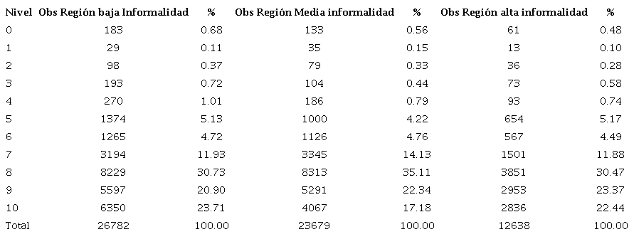 El Cuadro 1 presenta la frecuencia de los niveles de satisfacción con la vida. A partir de la información, se puede establecer que al menos siete de cada 10 personas reportaron un nivel de satisfacción con la vida igual o mayor a ocho. Las observaciones muestran que la región de alta informalidad tiende a acumular mayor cantidad de observaciones en los niveles superiores, pero no en la valoración máxima. Por lo demás, las tres regiones tienen un comportamiento similar en la distribución con asimetría hacia la derecha.