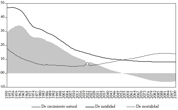 Como consecuencia, se produce un cambio progresivo en la estructura de la población total por grandes grupos de edad. El peso de los jóvenes alcanzó un máximo del 47,3% en 1965, cuando la población en edad laboral registraba un peso inferior al 50% y los adultos mayores representaban solo el 3%. La PET alcanzó un pico del 69,6% en 2020, con los jóvenes en un 21,9% y los adultos mayores en un 8,5%. Finalmente, en ausencia de flujos migratorios, se espera que en 2100 los adultos mayores representen el 34,1%, con los jóvenes en un 12,7% y la PET en un 53,2% (UNDESA 2022)