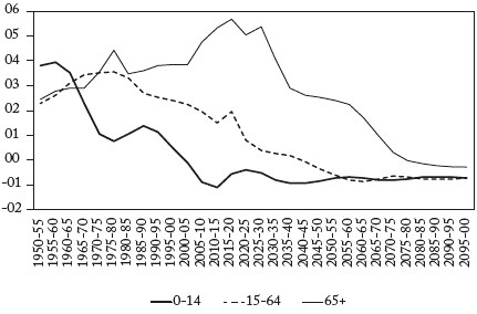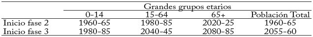 La primera clase de edad ingresó en la segunda fase a principios de la década de 1960 y comenzó a disminuir en el quinquenio 198085; la PET ingresó en la segunda fase en 1980-85 y comenzará a disminuir en unas dos décadas. Finalmente, los adultos mayores están comenzando ahora a crecer a tasas decrecientes e iniciarán su disminución junto con los otros dos grupos en 2080-85.