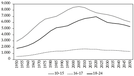 La situación ha cambiado progresivamente en las décadas siguientes (Figura 3). La población en edad escolar obligatoria, después de alcanzar un máximo de 8,6 millones en 2005, ha descendido a 7,6 millones y se espera que disminuya a alrededor de 6 millones para mediados de siglo. La población en edad universitaria (18-24 años) acaba de alcanzar un máximo de casi 7 millones y se espera que descienda a 5,3 millones en 2050.