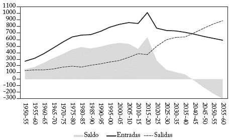 La Figura 4 y, más detalladamente, la Figura 5, muestran cómo las entradas generacionales pasaron de 270.000 durante el período 1950-55 a un máximo de 840.000 entre 2010 y 2015 y luego habrían disminuido si no hubiera intervenido una masiva inmigración de Venezuela, en su mayoría de personas en edad laboral. A este fenómeno se le atribuye el pico de entradas registrado en el quinquenio 2015-2020. Ahora, los datos de las entradas están volviendo a lo largo de la tendencia anterior y se espera que las entradas generacionales caigan por debajo de los 600.000 en 20502.