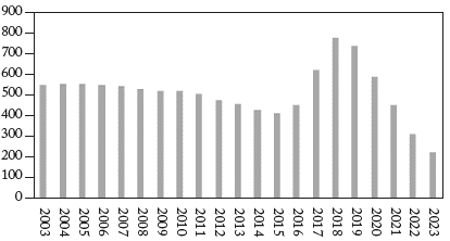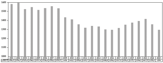 Volviendo a Colombia, la figura 8 muestra la evolución del IEDT de 2001 a 2023. Como ya hemos visto, el índice mide el número de no ocupados que cada 1,000 ocupados deben mantener, además de sí mismos. Su tendencia de largo plazo es a la baja, aunque se revela la presencia de oscilaciones cíclicas que reflejan el impacto de la crisis financiera (2007-08), la desaceleración de la economía nacional a partir de 2015 y la pandemia del Covid (2020-21).