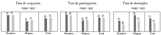 Los principales indicadores (15-64 años) del mercado laboral permiten resumir estas tendencias (Figura 6). La tasa de ocupación, el indicador más relevante del mercado laboral, aumentó más de 3 puntos porcentuales, pasando del 59,9% al 63% entre 2001 y 2023. El crecimiento está totalmente explicado por el aumento de la tasa femenina, que pasó del 46% al 51,4%, frente a un aumento marginal en la tasa masculina (del 74,7% al 75,3%).